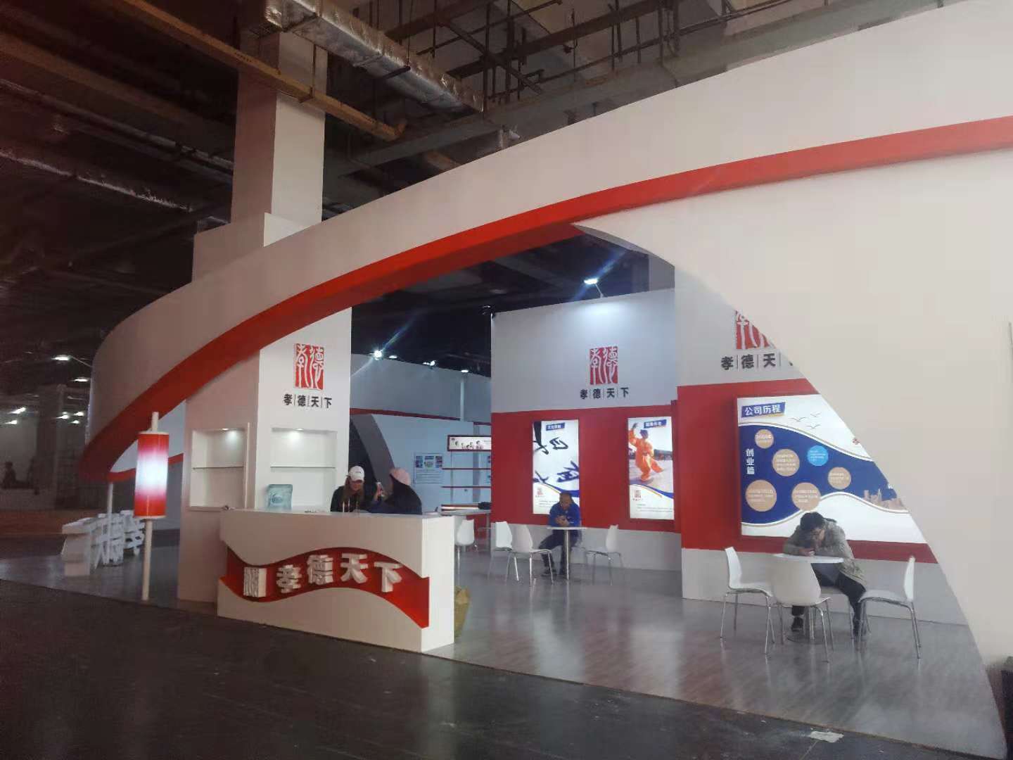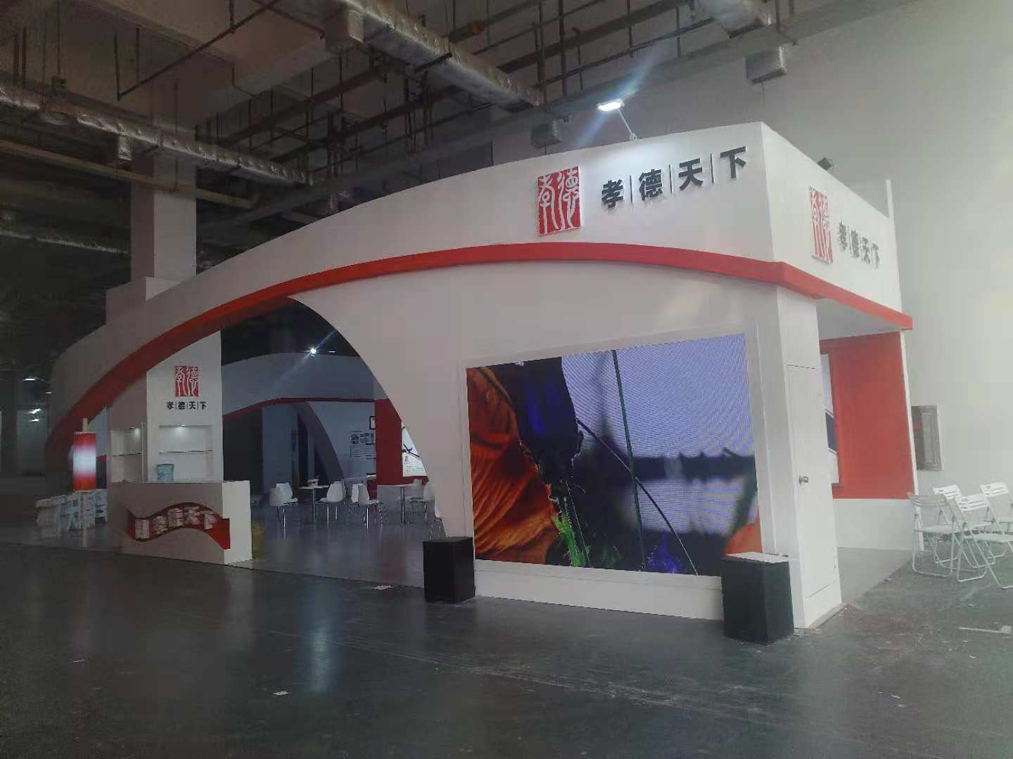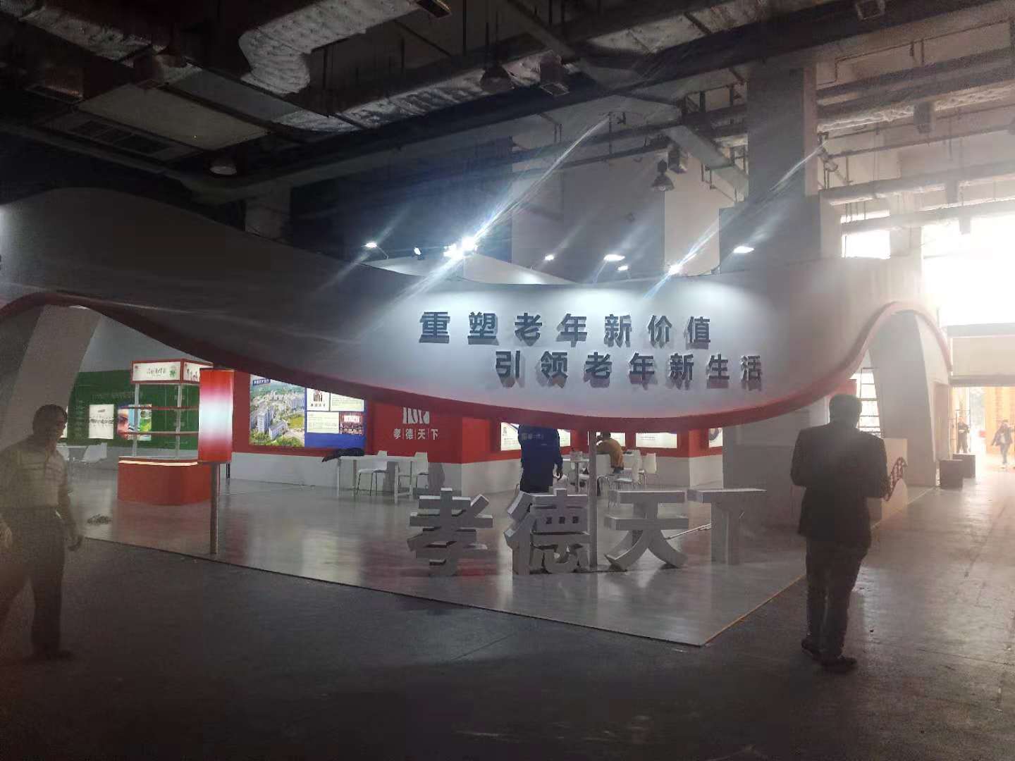 根據(jù)“孝德天下養(yǎng)老集團(tuán)”獨(dú)有的特色,魯班展覽設(shè)計(jì)團(tuán)隊(duì)打造以白色為主色調(diào)的簡約大氣的展臺,避免了繁復(fù)的構(gòu)造,以超高辨識度亮相此次展會。魯班設(shè)計(jì)團(tuán)隊(duì)準(zhǔn)確應(yīng)用孝德天下VI元素,突出LOGO,傳達(dá)“以孝立德,德行天下”的品牌文化。