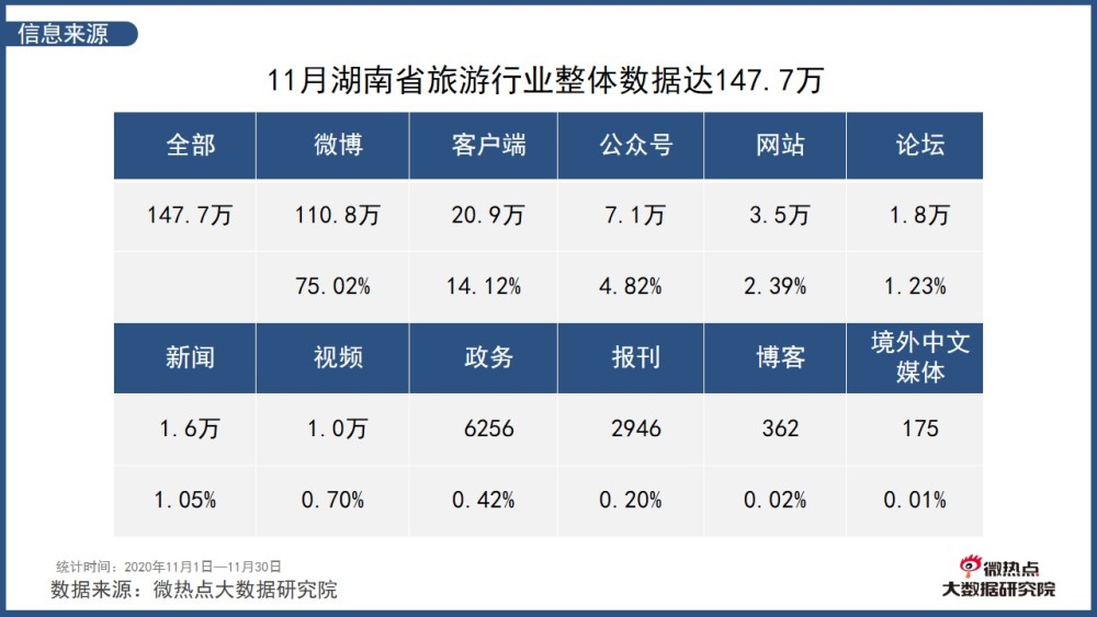 在統(tǒng)計時段內(nèi),涉及湖南省旅游行業(yè)的相關(guān)信息共有147.7萬條,其中75.02%的信息來源于微博平臺,可見微博成為11月湖南省旅游行業(yè)相關(guān)信息的主要來源平臺。