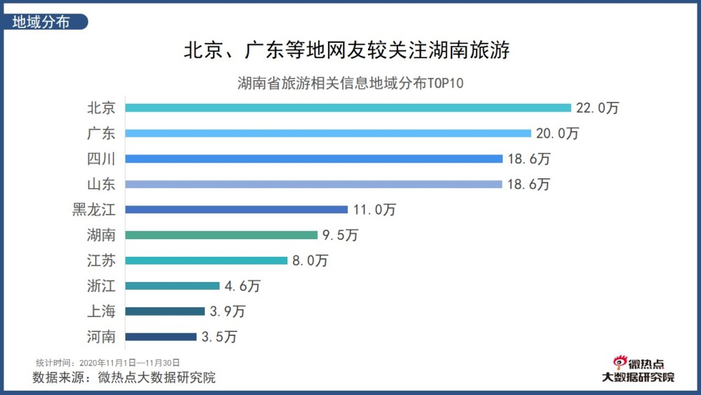 從地域分析看,北京、廣東、四川、山東、黑龍江等地的網(wǎng)友對湖南旅游的相關(guān)信息較為關(guān)注,信息量均超過10萬。湖南省網(wǎng)友對本省的旅游信息關(guān)注度排名第六,產(chǎn)生了9.5萬條信息。同時,江蘇、浙江、上海、河南等地的網(wǎng)友對湖南省旅游及其相關(guān)信息的關(guān)注度也比較高。