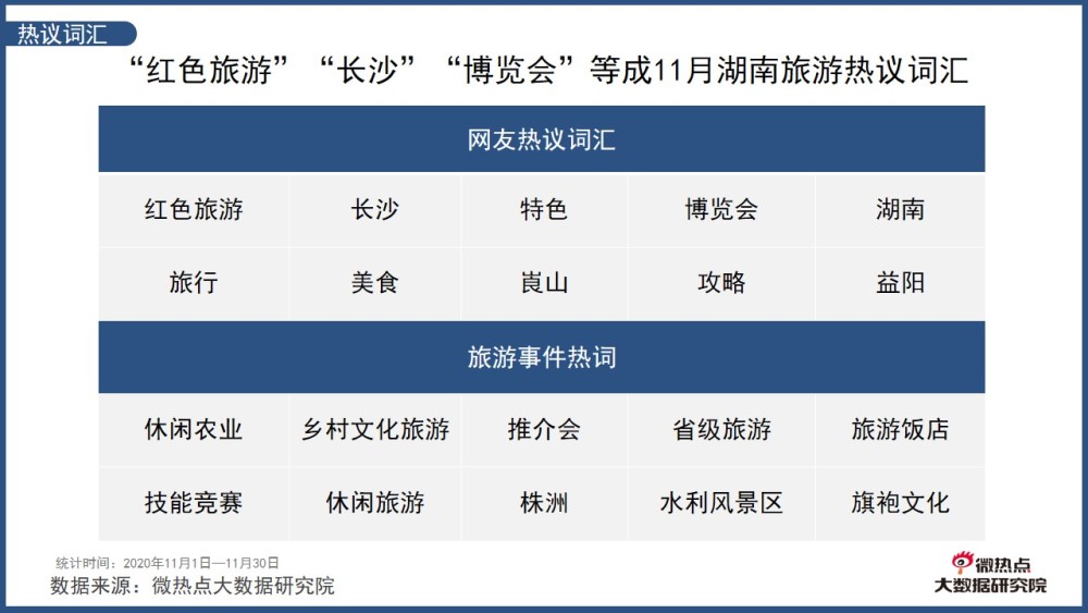 綜合2020年11月1日至11月30日“湖南旅游”相關(guān)信息中關(guān)鍵詞的詞頻、熱度權(quán)重、關(guān)聯(lián)強(qiáng)度因素,“紅色旅游”“長沙”“特色”“博覽會”“湖南”等詞語成為網(wǎng)友熱議詞匯。同時,“休閑農(nóng)業(yè)”“鄉(xiāng)村文化旅游”“推介會”“旅游飯店”“技能競賽”等詞語的出現(xiàn)側(cè)面看出本月湖南旅游事件對整體湖南旅游信息有一定影響。