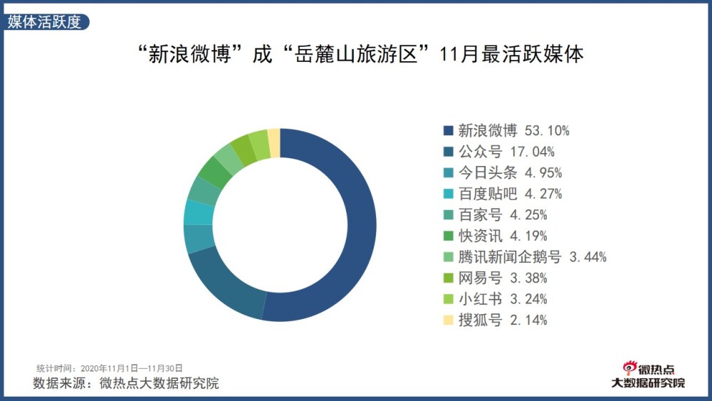 在11月發(fā)布“岳麓山旅游區(qū)”相關(guān)信息的媒體中,“新浪微博”的媒體活躍度最高,占比達(dá)53.10%。其中新浪育兒名博 旅行玩家@fefe喆媽 發(fā)布“岳麓山旅游區(qū)旅游預(yù)告”成為當(dāng)月岳麓山旅游區(qū)相關(guān)的熱門微博內(nèi)容,轉(zhuǎn)發(fā)量達(dá)3156次。