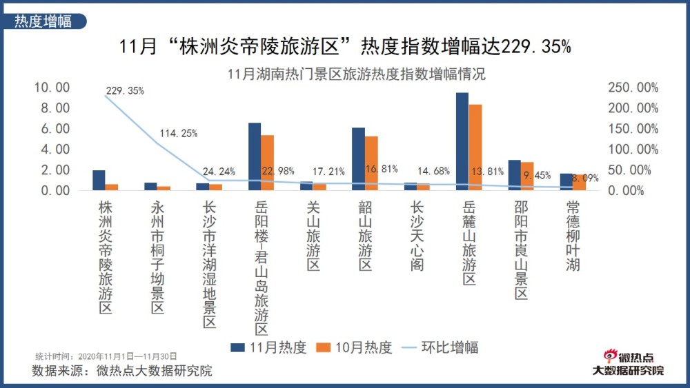 11月湖南熱門景區(qū)中,“株洲炎帝陵旅游區(qū)”熱度增幅位居第一名,熱度指數(shù)環(huán)比增幅高達(dá)229.35%。11月26日,第八屆中部六省炎黃文化論壇在株洲開幕,來自湖北、湖南、河南、安徽、江西、山西中部六省及其他地區(qū)的200名專家學(xué)者,齊聚一堂,共同探討中國炎黃文化與中華傳統(tǒng)文化。此次論壇,專家學(xué)者圍繞“神農(nóng)嘗百草”的精神內(nèi)涵與當(dāng)代價值、黃河文化若干問題的思考、從歷代碑刻看炎帝文化內(nèi)核及其時代價值、炎黃文化在新時代國家治理體系中的傳承與創(chuàng)新等內(nèi)容進(jìn)行研討。第八屆中部六省炎黃文化論壇成為當(dāng)月“株洲炎帝陵旅游區(qū)”熱門事件,也直接推動了景區(qū)熱度上漲。