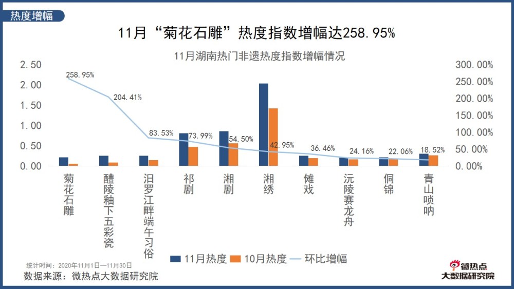11月湖南熱門非遺中,“菊花石雕”熱度指數(shù)環(huán)比增幅位居第一,熱度指數(shù)環(huán)比增幅達(dá)258.95%。11月5日,湖南非遺專題展示館攜14項湖南國家級非物質(zhì)文化遺產(chǎn),亮相第三屆中國國際進(jìn)口博覽會。瀏陽的石雕(菊花石雕)、湘西的土家族織錦、長沙的湘繡、益陽的黑茶制作、江永的女書……非遺傳承人現(xiàn)場演示制作過程,展示制作技藝,并讓海內(nèi)外觀眾互動參與,感受湖南非遺文化的博大精深。
