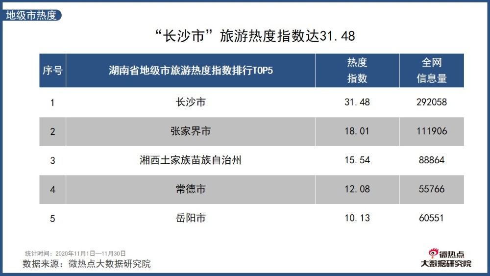 本月湖南省地級市中,“長沙市”旅游熱度指數(shù)為31.48,為本月湖南旅游熱度指數(shù)最高的地級市,其次為“張家界市”和“湘西土家族苗族自治州”?!?020中國紅色旅游博覽會在長沙開幕”“2020年湖南省旅游飯店業(yè)職業(yè)技能競賽開幕”“2020中國休閑旅游博覽會開幕”等成為11月“長沙市”熱門旅游事件。