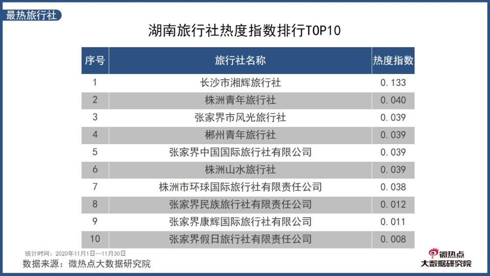 湖南11月旅行社熱度指數(shù)排行TOP10